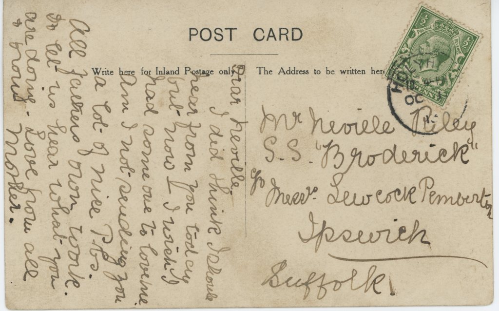 By 1913 Neville Riley was serving as a 17 year old Cadet on the Blue Star ship SS Broderick. We know this from a postcard sent from his mother, Miriam. The photograph was taken by his father, probably at Penrhos.