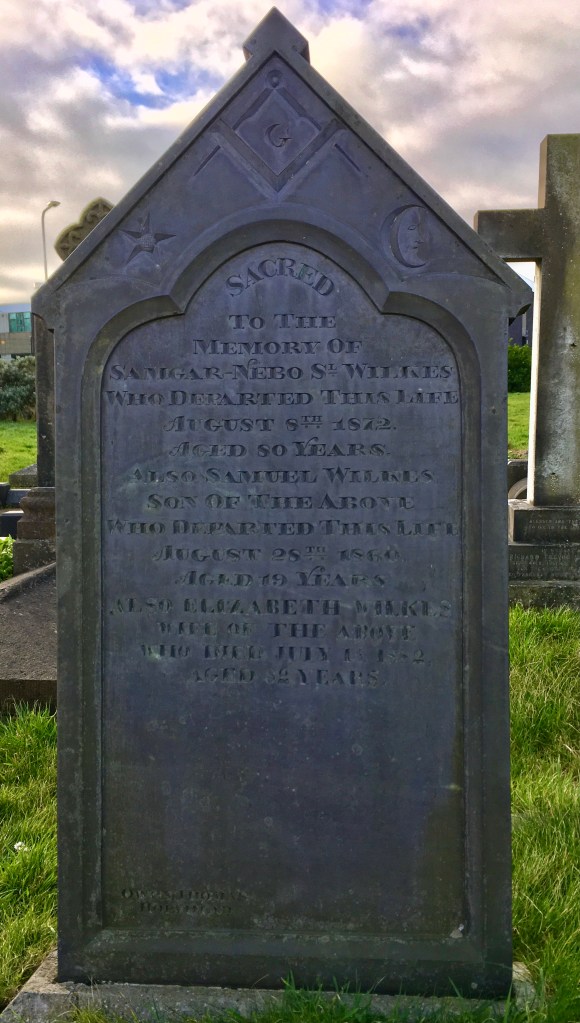 It was at the same time that Wilkes also abandoned his sea going career to take up a position at the new Packet Yard at Holyhead. He married the widow Elizabeth Watkins, nee Morris (his third wife) at Holyhead in 1835, living for most of the rest of his life at 14 Millbank Gardens, Holyhead. He descibed himself at various times as an Engineer, Boilermaker, Brazier and Coppersmith and became a very colourful character around the town. He was father to seven children – four sons and three daughters. He died in 1872 and was buried in St Seiriolโs Church Cemetery. It is believed that he was one of the original founders of the Hibernia, later St. Cybi, Masonic Lodge at Holyhead, as evidenced by the ensignia on his gravestone.